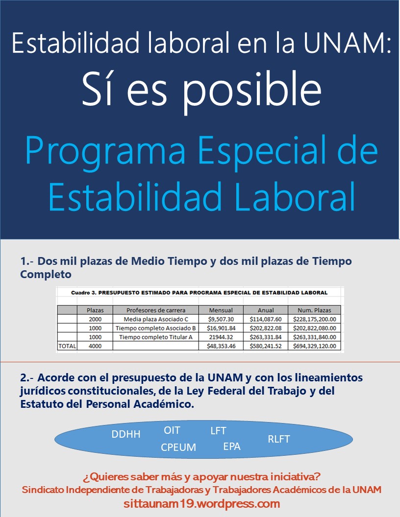 Luchamos por el reconocimiento, mejoramiento y defensa del personal académico, por adecuadas condiciones de trabajo, por un salario justo, estabilidad en el empleo, formación docente, por el libre ejercicio de nuestra actividad académica, en un marco de democratización de la UNAM.