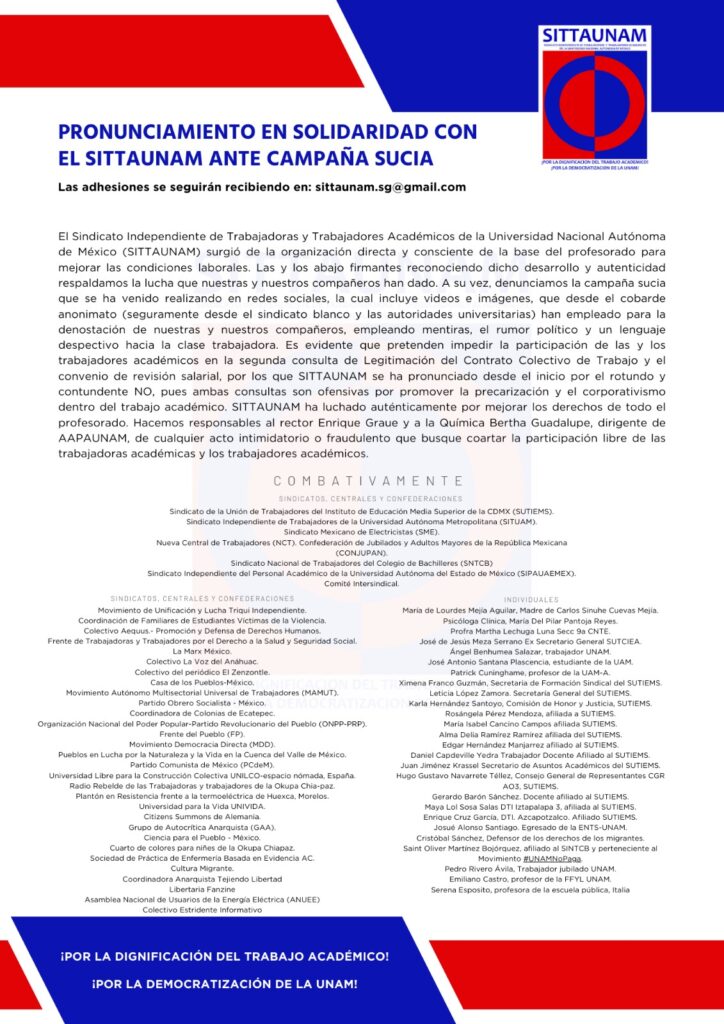 Pronunciamiento en solidadridad con el SITTAUNAM