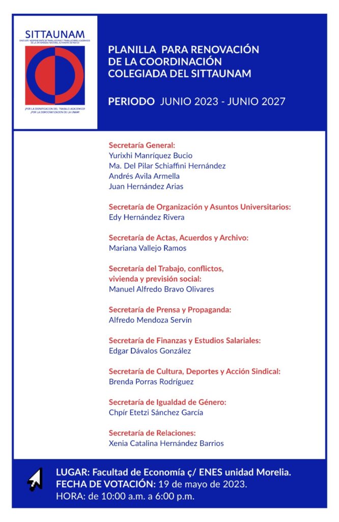 Como está estipulado en nuestro Estatuto, la Coordinación Colegiada (Conjunto de Secretarías del SITTAUNAM) deberá renovarse cada cuatro años, para lo cual se ha resgistrado una planilla. Las votaciones se llevarán a cabo el próximo viernes 19 de mayo de 10:00 a 18:00 horas. En la Facultad de Economía (Ciudad Universitaria) y en la ENES unidad Morelia.